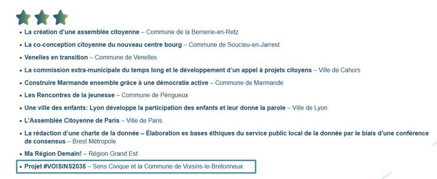 Suite aux activités citoyennes proposées, le projet #Voisins2035 a été récompensé aux "Trophées Nationaux de la Participation & de la concertation 2022", le 8 décembre 2022, à Grenoble.